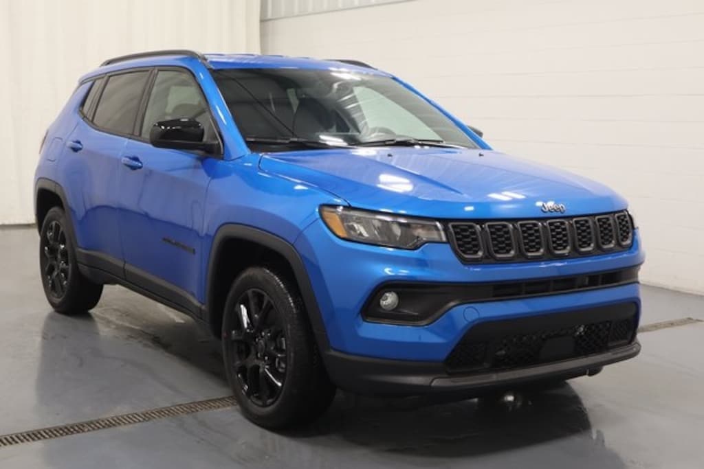 3Hydro Blue Pearlcoat 2026 Jeep Compass Latitude 4WD 8-Speed Automatic 2.0L I4 DOHC Compass Latitude, 2.0L I4 DOHC, 4WD, ydro Blue Pearlcoat, 10.1" Touchscreen Display, 6 Speakers, Air Conditioning ATC with Dual Zone Control, Altitude Special Edition, AM/FM radio: SiriusXM, Black Day Light Opening Moldings, Bluetooth Handsfree Phone and Audio, Electronic Stability Control, Front fog lights, Fully automatic headlights, Gloss Black Surround/Neutral Gray Rings, Heated door mirrors, Heated front seats, Heated steering wheel, Neutral Gray Exterior Badging, ParkView Rear Back-Up Camera, Piano Black Interior Accents, Power 2-Way Driver Lumbar Adjust, Power Adjust 8-Way Driver Seat, Power door mirrors, Power Liftgate, Premium audio system: UConnect 5, Quick Order Package 29N Altitude, Radio: Uconnect 5 with 8.4" Display, Remote keyless entry, Sliding Sun Visors with Illuminated Mirrors, Spoiler, Steering wheel mounted audio controls, Variably intermittent wipers, Wheels: 18" x 7" Gloss Black Painted Aluminum. Price includes: $1000 - 2026 National Retail Bonus Cash . Exp. 02/02/2026 $1500 - 2026 National SFS Lease Loyalty Bonus Cash . Exp. 02/02/2026 $1500 - 2026 National Stellantis Loyalty Retail Bonus Cash . Exp. 02/02/2026 $500 - 2026 National 2026 First Responder Bonus Cash . Exp. 01/04/2027