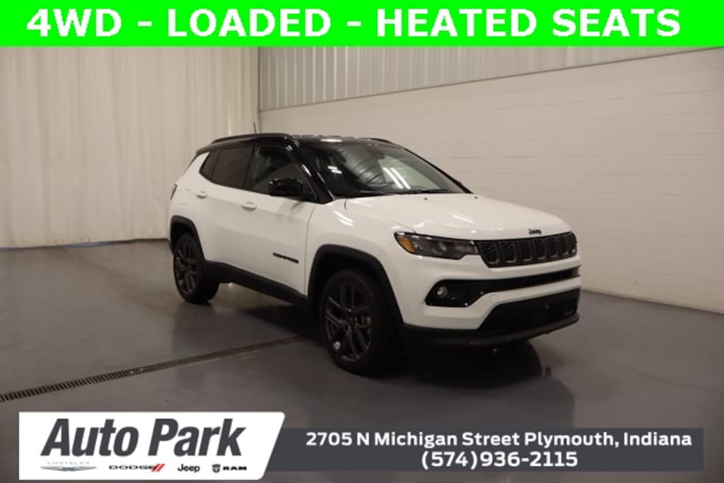 Bright White Clearcoat 2026 Jeep Compass Limited 4WD 8-Speed Automatic 2.0L I4 DOHC 4WD, Bright White Clearcoat, Black Artificial Leather, Alloy wheels, Auto High-beam Headlights, Automatic temperature control, Black Day Light Opening Moldings, Electronic Stability Control, Front dual zone A/C, Front fog lights, Gloss Black Surround/Neutral Gray Rings, Heated door mirrors, Heated front seats, Heated steering wheel, Limited Altitude Pack, Neutral Gray Exterior Accents, Neutral Gray Exterior Badging, ParkView Rear Back-Up Camera, Piano Black Interior Accents, Power door mirrors, Power driver seat, Power Liftgate, Quick Order Package 29W Limited Altitude, Radio: Uconnect 5 w/10.1" Display, Remote keyless entry, Spoiler, Steering wheel mounted audio controls, Tilt steering wheel, Traction control, Turn signal indicator mirrors, Wheels: 18" x 7" Painted Diamond Cut Aluminum, Wheels: 19" x 7.5" Aluminum Painted. Price includes: $1000 - 2026 National Retail Bonus Cash . Exp. 12/01/2025 $1500 - 2026 National SFS Lease Loyalty Bonus Cash . Exp. 12/01/2025 $1500 - 2026 National Stellantis Loyalty Retail Bonus Cash . Exp. 12/01/2025 $500 - 2026 National 2026 First Responder Bonus Cash . Exp. 01/05/2026 $1,250 - Exp. 11/30/2025