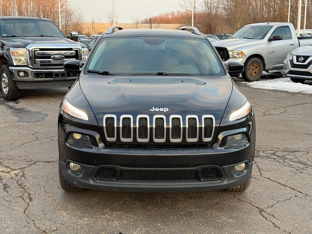 Vehicle Is Equipped With Cold Weather Group (Accessory Switch Bank Module, Air Conditioning, All-Season Floor Mats, Engine Block Heater, Exterior Mirrors w/Heating Element, Heated Front Seats, Heated Steering Wheel, Leather Wrapped Steering Wheel, Power Heated Mirrors, Remote Start System, Steering Wheel Mounted Audio Controls, and Windshield Wiper De-Icer), Quick Order Package 24J, Cherokee Latitude, 4D Sport Utility, 2.4L I4, 9-Speed 948TE Automatic, 4WD, Diamond Black Crystal Pearlcoat, Black w/Cloth Low-Back Bucket Seats, 17" x 7" Aluminum Wheels, 3.734 Axle Ratio, 4-Wheel Disc Brakes, 6 Speakers, 600 Amp Maintenance Free Battery, ABS brakes, Active Grille Shutters, Alloy wheels, AM/FM radio, Anti-whiplash front head restraints, Brake assist, Bumpers: body-color, Cloth Low-Back Bucket Seats, Compass, Delay-off headlights, Driver door bin, Driver vanity mirror, Dual front impact airbags, Dual front side impact airbags, Electronic Stability Control, Engine Oil Cooler, Flex Fuel Vehicle, Four wheel independent suspension, Front anti-roll bar, Front Bucket Seats, Front Center Armrest, Front fog lights, Front reading lights, Fully automatic headlights, High intensity discharge headlights: Bi-Xenon, Illuminated entry, Knee airbag, Low tire pressure warning, Normal Duty Suspension, Occupant sensing airbag, Outside temperature display, Overhead airbag, Overhead console, Panic alarm, ParkView Rear Back-Up Camera, Passenger door bin, Passenger vanity mirror, Power door mirrors, Power steering, Power windows, Radio data system, Radio: Uconnect 3 w/5" Display, Rear anti-roll bar, Rear reading lights, Rear seat center armrest, Rear side impact airbag, Rear window defroster, Rear window wiper, Remote keyless entry, Roof rack: rails only, Speed control, Speed-sensing steering, Split folding rear seat, Spoiler, Tachometer, Telescoping steering wheel, Tilt steering wheel, Traction control, Trip computer, Variably intermittent wipers, and Voltmeter.