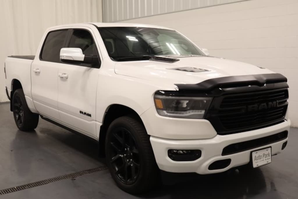 2022 Ram 1500 Ivory White Tri-Coat Pearlcoat Sport ACCIDENT FREE VEHICLE HISTORY, NON-SMOKER, ONE OWNER, 8-Speed Automatic, 115V Rear Auxiliary Power Outlet, 2nd Row In-Floor Storage Bins, 4 MOPAR Adjustable Cargo Tie-Down Hooks, ABS brakes, Adjustable pedals, Alloy wheels, AM/FM radio: SiriusXM, Apple CarPlay/Android Auto, Bed Utility Group, Comfort & Convenience Group, Compass, Dome Dual LED Reading Lamps, Dual-Pane Panoramic Sunroof, Electronic Stability Control, Front fog lights, Front Heated Seats, Fully automatic headlights, Gloss Black Grille w/Black Surround, Heated door mirrors, Heated Exterior Mirrors, Heated front seats, Illuminated entry, Integrated Centre Stack Radio, Low tire pressure warning, Media Hub w/2 USB Charging Ports, Night Edition, Park-Sense Front/Rear Park Assist w/Stop, ParkView Rear Back-Up Camera, Pick-Up Box Lighting, Power driver seat, Quick Order Package 25L Sport, Radio: Uconnect 5 w/8.4" Display, Rain-Sensing Windshield Wipers, Rear Underseat Compartment Storage, Rebel Level 2 Equipment Group, Remote keyless entry, Remote Proximity Keyless Entry, Remote Start System, Remote Tailgate Release, Second-Row Heated Seats, Security Alarm, Sport Performance Hood, Traction control, Wheels: 22" x 9" Forged Aluminum, Wireless Charging Pad.